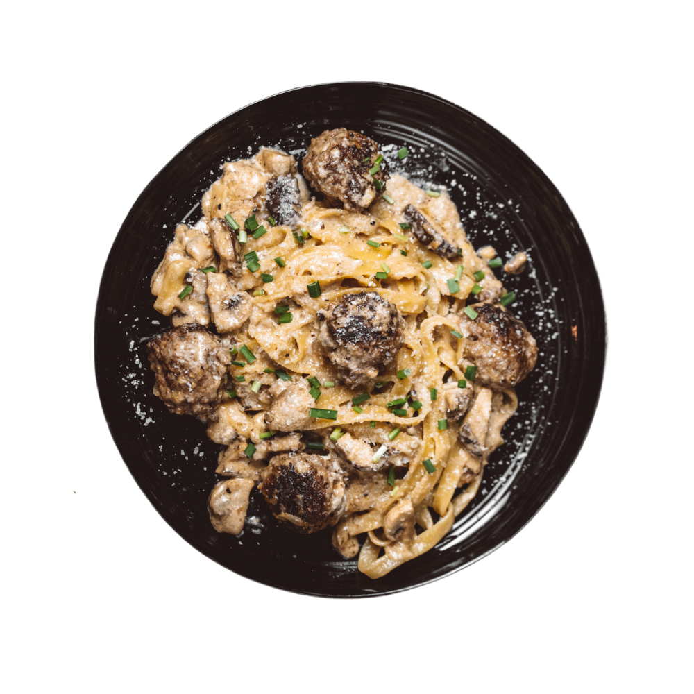 Homemade Tagliatelle, Creamy Stroganoff Sauce, Homemade Meatballs, Mixed Mushroom & Parmigiano